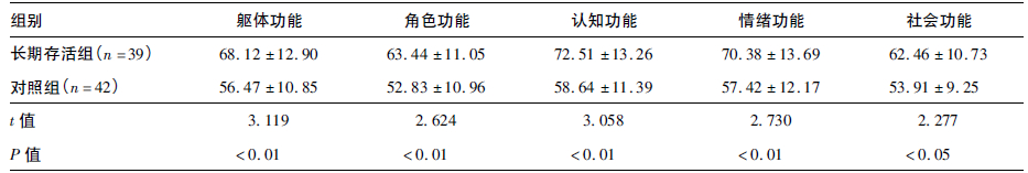 2组患者EORTCQLQ-C30生活质量问卷功能部分各指标比较,结果表明,长期存活组患者EORTC-QLQ-C30生活质量问卷功能部分躯体功能、角色功能、认知功能、情绪功能和社会功能得分均明显高于对照组患者(均P < 0.05)。