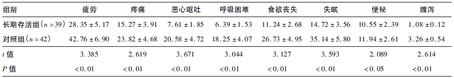 2组患者EORTC-QLQC30生活质量问卷症状部分各指标比较,结果表明,长期存活组患者的EORTC-QLQ-C30生活质量问卷症状部分疲劳、痛痛、恶心呕吐、呼吸困难、食欲丧失、失眠、便秘和腹泻症状得分均明显低于对照组患者(均P < 0.05)。