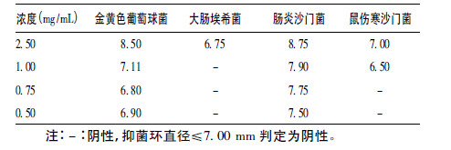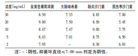 | 表 2 不同浓度没食子酸二次MIC 筛选试验抑菌环直径(mm) |