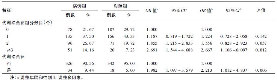 病例组具有代谢综合征的病例数明显多于对照组,且具有多个代谢综合征组分的病例也较对照组多。调整多因素后,与无代谢综合征组分者比较,有1个和2个组分者发生ARC的危险性升高,但差异均无统计学意义,而具有≥3个组分者发生ARC的危险性明显升高。随着代谢综合征组分数量增加,发生ARC的危险性逐渐增高(χ2=10.326,P<0.001)。