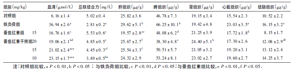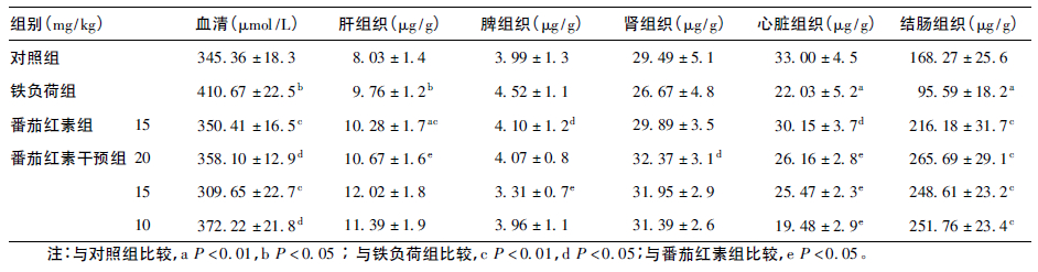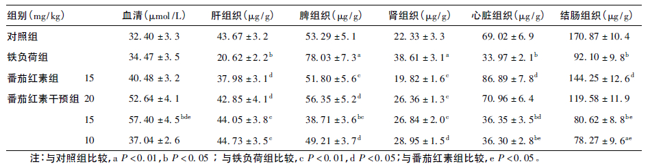 与对照组比较,铁负荷组大鼠血清铁含量增加明显(F=37.54,P<0.01) ,总铁结合力下降明显(F=17.58,P<0.01) ; 肝、脾、心脏和结肠组织中铁含量明显增加(F=7.36、7.06、23.13、10.89,P<0.05) 。与铁负荷组比较,番茄红素和中剂量番茄红素干预组大鼠血清铁含量、总铁结合力明显增加(F=10.05、 21.71、25.02、12.97,P<0.01) 。与番茄红素组比较,中、低剂量番茄红素干预组大鼠血清铁含量明显增加(F=12.38、36.78,P<0.01) ,总铁结合力明显下降(F=6.77、12.60,P<0.05) 。