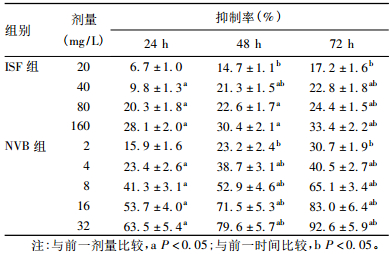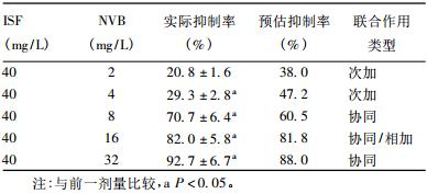 1.2.3 联合效应结果判定方法[5]采用 Weeb系数判定联合用药相互作用,预估抑制率(%) = A + B ― A × B,其中 A、B分别为 ISF、NVB单药作用抑制率。当实际抑制率 >预估抑制率时,表明联合用药有协同作用;当实际抑制率 =预估抑制率时,表明联合用药有相加作用;当预估抑制率 >实际抑制率 > A和(或) B时,表明联合用药有次加作用。
