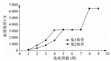 2 结果 2.1 免疫家兔剂量及兔血清效价变化(图 1)![]() | 图 1 兔血清效价随免疫时间变化 |