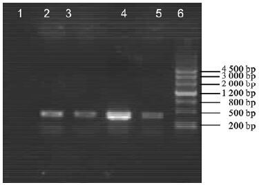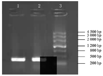 ![]() | 注:1、2:hspA基因PCR扩增产物;3:DNA marker。 图 1 hspA基因PCR扩增产物 |