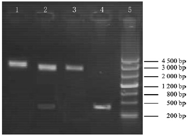 ![]() | 注:1:Xba I酶切产物;2:Nco I和Xba I双酶切产物;3:Xba I酶切产物;4:hspA基因PCR产物;5:DNA maker。 图 3 pHZ8110-hspA重组质粒酶切鉴定 |