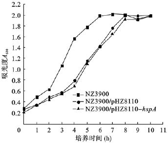 将NZ3900、NZ3900/pNZ8110、NZ3900/pNZ8110-hspA活化种子液分别转种后,前2 h内细菌生长较为缓慢,随后细菌进入对数生长期,约8 h后细菌生长进入平台期,吸光度A600值达2.0左右。虽然NZ3900/pNZ8110和NZ3900/pNZ8110-hspA菌株在对数生长期内,生长速度较空菌NZ3900缓慢,但进入平台期后细菌浓度与空菌比较无明显差异,提示hspA基因的插入并未对菌株生长造成影响。