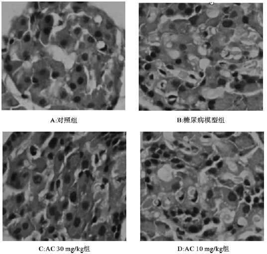 对照组大鼠胰岛呈圆形或椭圆形细胞团,境界清晰,胰岛数量较多,胰岛细胞分布均匀,结构清晰呈索状排列,细胞核大小均匀呈圆形,胞浆丰富 (图 1A)。糖尿病模型组可见胰岛萎缩,胰岛数目减少,体积明显缩小,形态不规则,边界不清,胰岛内细胞数量减少,排列松散,细胞形态不一,胞浆出现空泡,细胞核固缩、核溶解(图 1B)。与糖尿病模型组比较,AC 30 mg/kg组胰岛病变较轻,胰岛体积增大,岛内细胞数目增多,细胞排列趋于规整 (图 1C),但AC 10 mg/kg组改变不明显(图 1D)