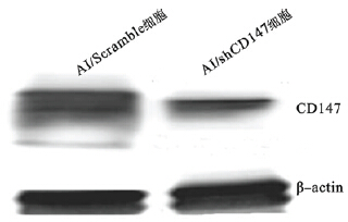 ![]() | 图 2 Western blot鉴定转染RNAi载体后CD147蛋白表达 |