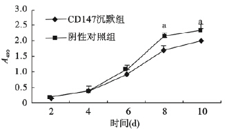 与阴性对照比较,CD147干扰组细胞培养至第6 d 时,细胞生长速度减慢,至第8、10 d 细胞生长明显受到抑制(P<0.05)。