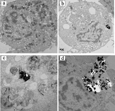 ![]() | 注:a:对照组,×8000;b:20 μg/cm2 0.5 h组,×8000;c:20 μg/cm2 1 h组,×15000;d:40 μg/cm2 2 h组,×10000。 图 1 DU颗粒染毒巨噬细胞透射电镜观察 |