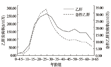 不同年龄组人群乙肝和急性乙肝年均发病率流行曲线相似,均为单峰分布。自10岁~组始,两者年均发病率均呈直线上升趋势,最高峰在25岁~组,之后发病率急速下降,40岁~组后下降速度放缓。