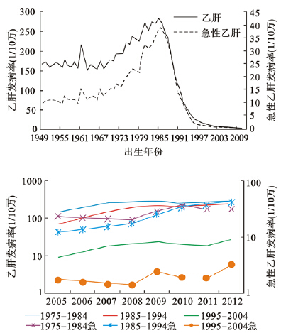 不同年代出生人群乙肝发病情况分析表明,乙肝疫苗的接种在乙肝疫情防控方面有重大作用。自1986年中国开始使用乙肝疫苗以来,福建省在此之后出生的人群乙肝发病率呈直线下降趋势;特别在2002年乙肝疫苗纳入儿童计划免疫后,发病率再降新低。虽然1975—1984年出生人群的乙肝和急性乙肝发病率高于1985—2004年出生人群,但是后者的年均增长速度高于前者。