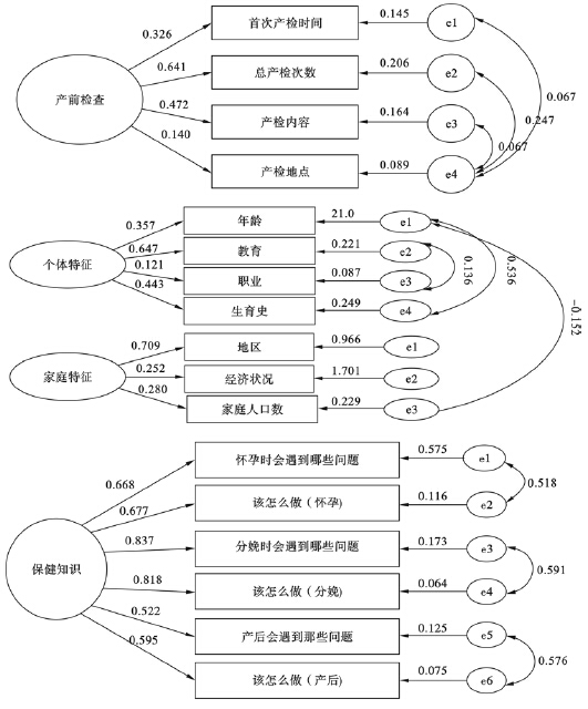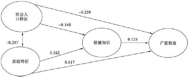 ![]() | 注:各通径上数值为变量间的标化回归系数。 图 1 农村育龄妇女产前检查及其影响因素测量模型 |