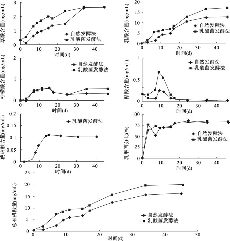 图 1 自然发酵法和乳酸菌接种发酵法生产酸菜有机酸含量变化图 |