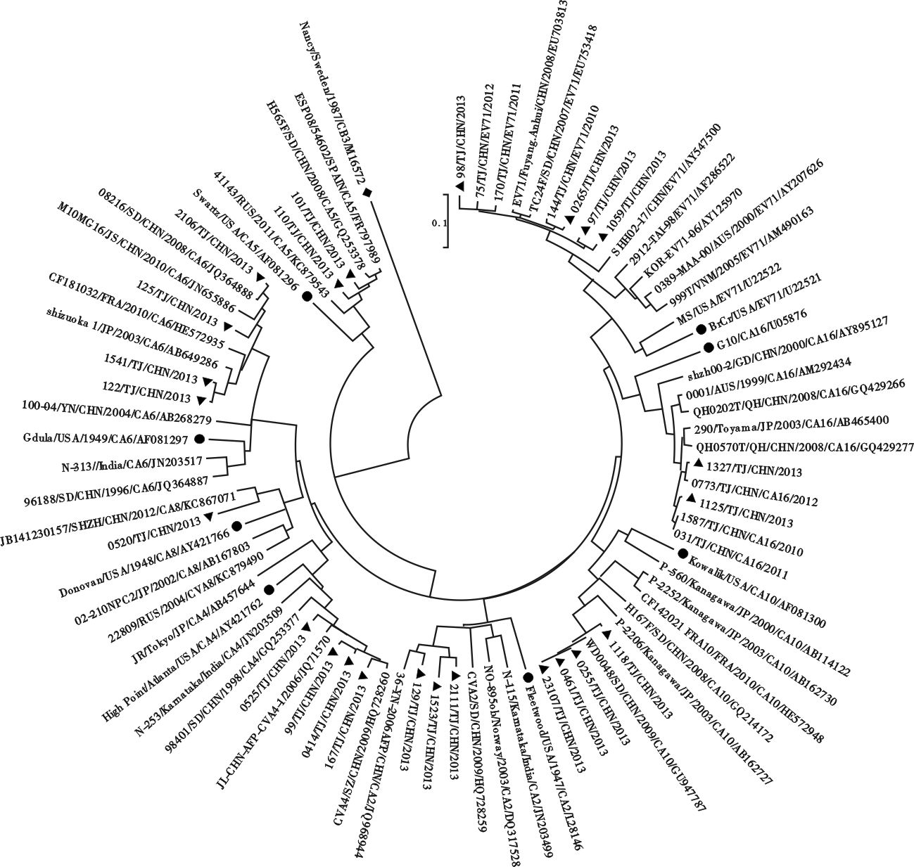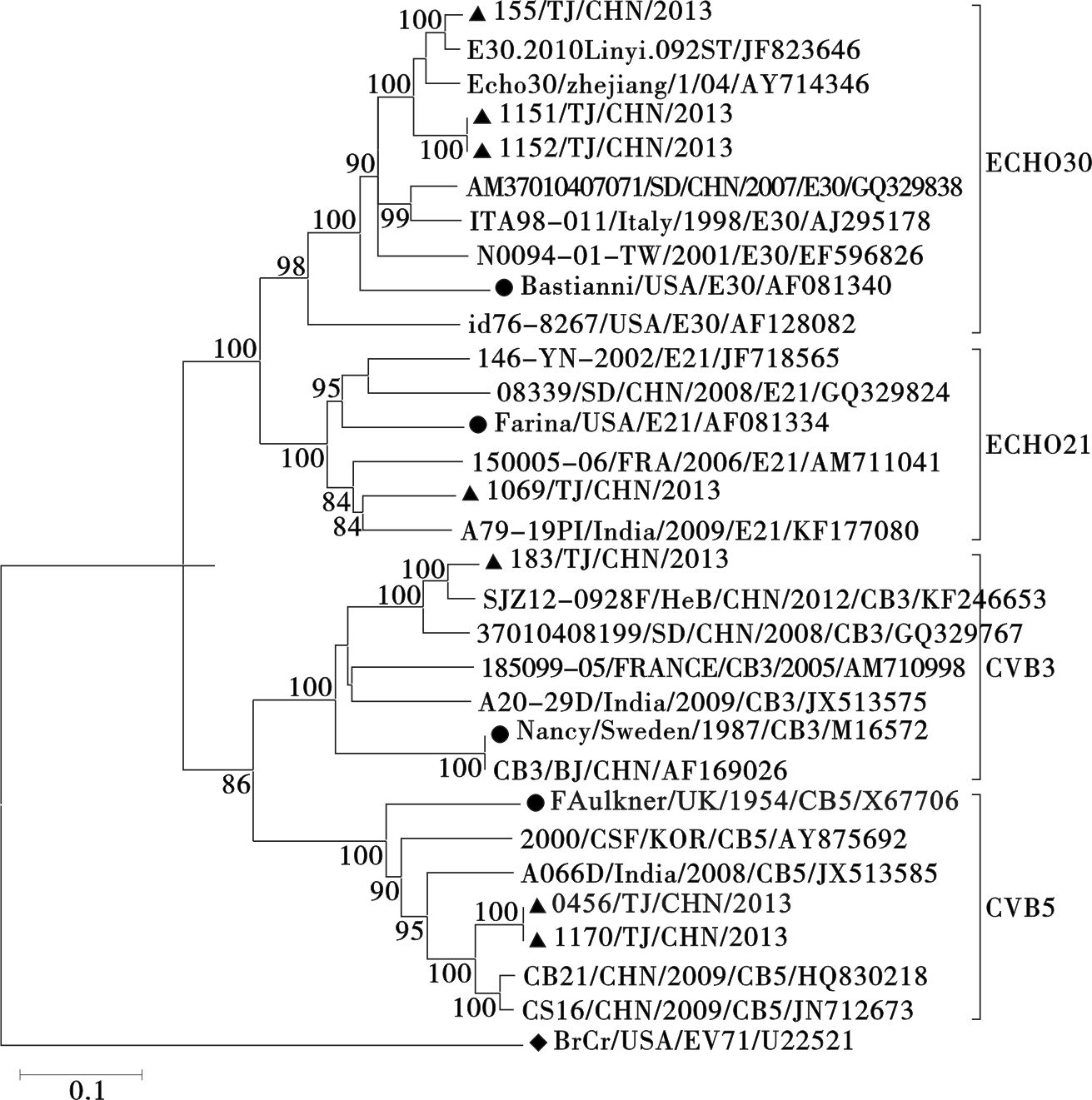 图 2 注:▲为2013年天津市HFMD HEV-B分离株;●为各基因型别原型株;◆为组外对照;各参考株按毒株名/分离国家/分离年代/基因型别/序列号排列。 2013年天津市HFMD HEV-B型VP1区种系发生树 |