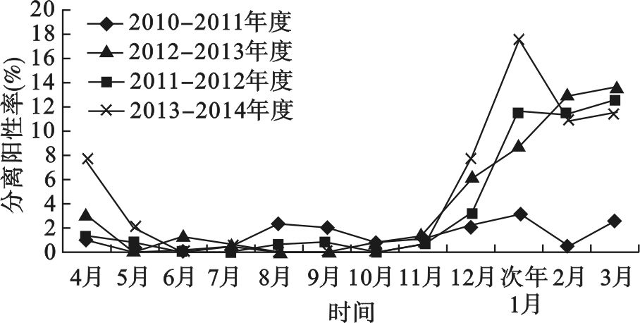 图 1 辽宁省2010—2014年度流感毒株分离阳性率时间分布 |