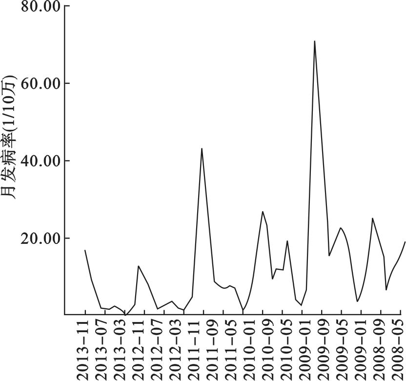 1 资料与方法 1.1 资料来源资料来源于“中国疾病预防控制信息系统”中2008年5月—2014年7月按发病日期统计的湖南省各月手足口病报告月发病率,包括临床诊断病例和实验室诊断病例。