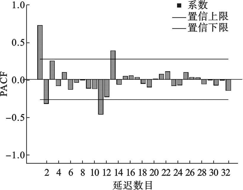 为了降低方差以及消除季节性的影响,对原始时间序列进行1次平方根转换和1次季节性差分。图 2显示,进行1次季节性差分后的序列接近平稳,由此初步暂定SARIMA(p,d,q)×(P,D,Q)12模型中的d和D分别为0和1。图 3显示,自相关系数(auto correlation function,ACF)呈缓慢余弦周期性衰减,拖尾,具有伪周期性,提示是平稳序列。图 4显示,偏自相关系数(partial auto correlation function,PACF)在滞后值lag=13处近似截尾。