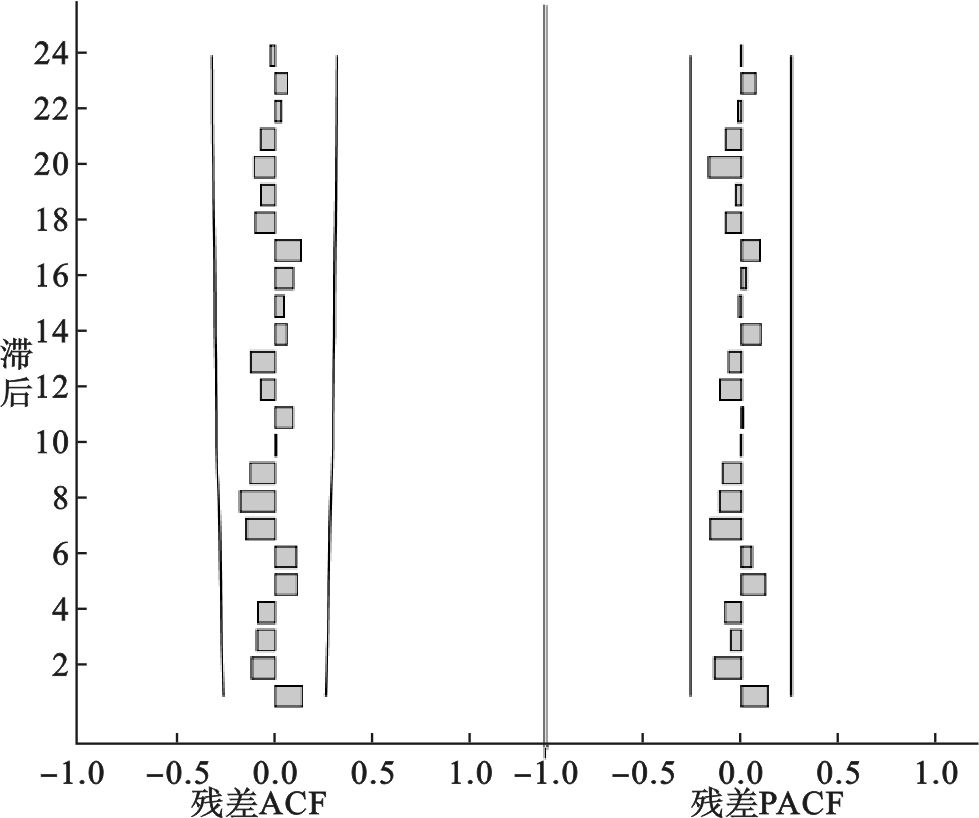 对选定的模型进行白噪声检验,残差的ACF和PACF图见图 5。图 5显示,残差的ACF和PACF均在95%CI以内,且Ljung-Box Q=15.420,P=0.494,残差序列为白噪声,表明拟合的该模型合理。