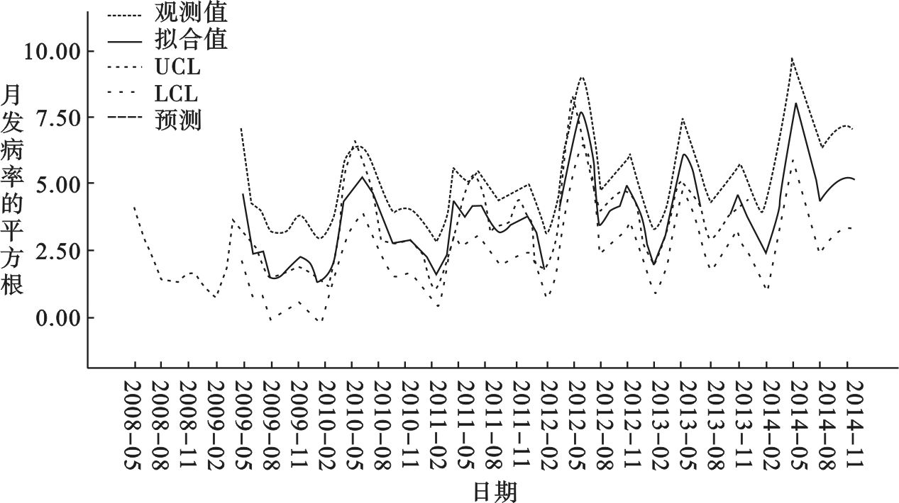 1.2 统计分析采用SPSS 18.0软件进行统计分析。以2008年5月—2013年12月的手足口病月发病率数据为基础,在“Define Date”模块和“ForeCasting”模块中分析,通过创建时间序列、数据平稳化处理、模型的识别、模型的参数估计和白噪声检验等步骤建立模型[7, 8],对2014年1月—2015年7月的发病率进行预测,并以2014年1-7月的实际数据进行验证。SARIMA模型建立在差分自回归移动平均模型(autoregressive integrated moving average model,ARIMA)[9]基础上,增加了对季节性和周期性的分析。SARIMA模型的数学表达式为:φ(B)(1-B)dφ(BS)(1-BS)DYt=ψ(B)Φ(BS)εt。其中,Yt=φ1Yt-1+φ2Yt-2+…+φpYt-p+εt-ψ1εt-1-ψ2εt-2-…-ψqεt-q;φ(B)=1-φ1B1-φ2B2-…-φpBp,φ(BS)=1-φ1BS,1-φ2BS,2-…-φpBS,P;ψ(B)=1-ψ1B-ψ2B2-…-ψpBq,Φ(BS)=1-Φ1BS,1-Φ2BS,2-…-ΦQBS,Q。B是后移算子,p是AR(p)项的阶数,q是MA(q)项的阶数,d是简单差分的阶数;εt是时间序列在t期的误差或偏差,εt-p是时间序列在t期的误差或偏差;P是SAR(P)项的阶数,Q是SMA(Q)项的阶数,D是季节性差分的阶数。SARIMA模型可以表示为SARIMA(p,d,q)×(P,D,Q)S,包含非季节性部分(p,d,q)和季节性部分(P,D,Q)S,非季节性部分即ARIMA(p,d,q)[10]。