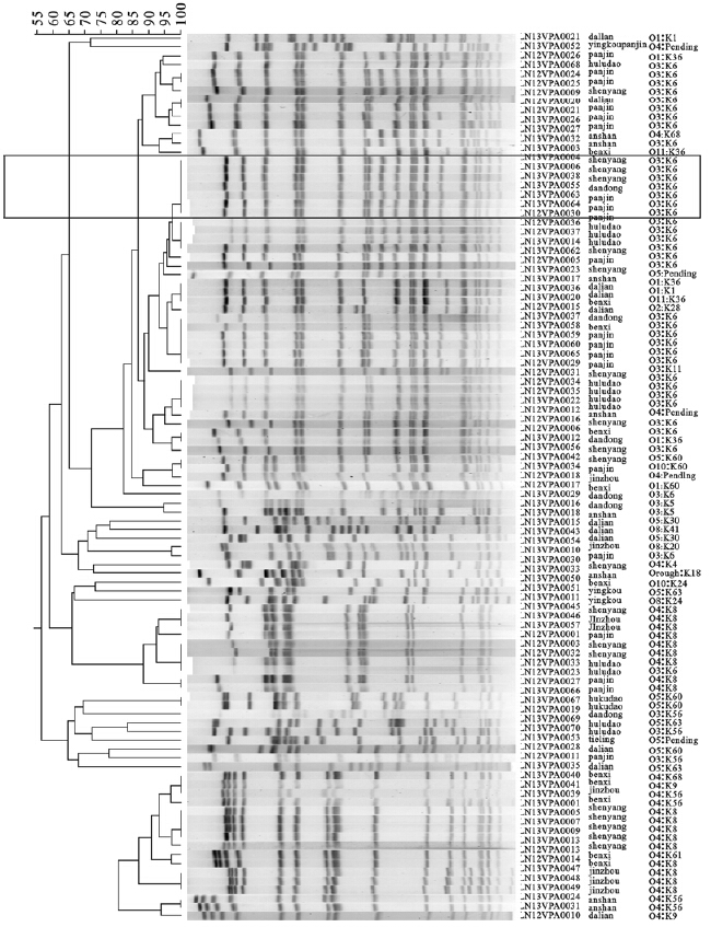经Not Ⅰ酶切,101株副溶血弧菌产生63种PFGE型别,38株O3:K6型菌株分成19种PFGE型别,总体相似度为54.147%,带型分散,每种带型所包含的菌株最多不超过7株。在对2013年辽宁省副溶血弧菌PFGE分子分型结果比对分析中,发现3株来自沈阳的O3:K6型菌株PFGE电泳条带相同,4株来自盘锦的O3:K6型菌株PFGE电泳条带相同,其他各带型间无地区和时间分布差异。