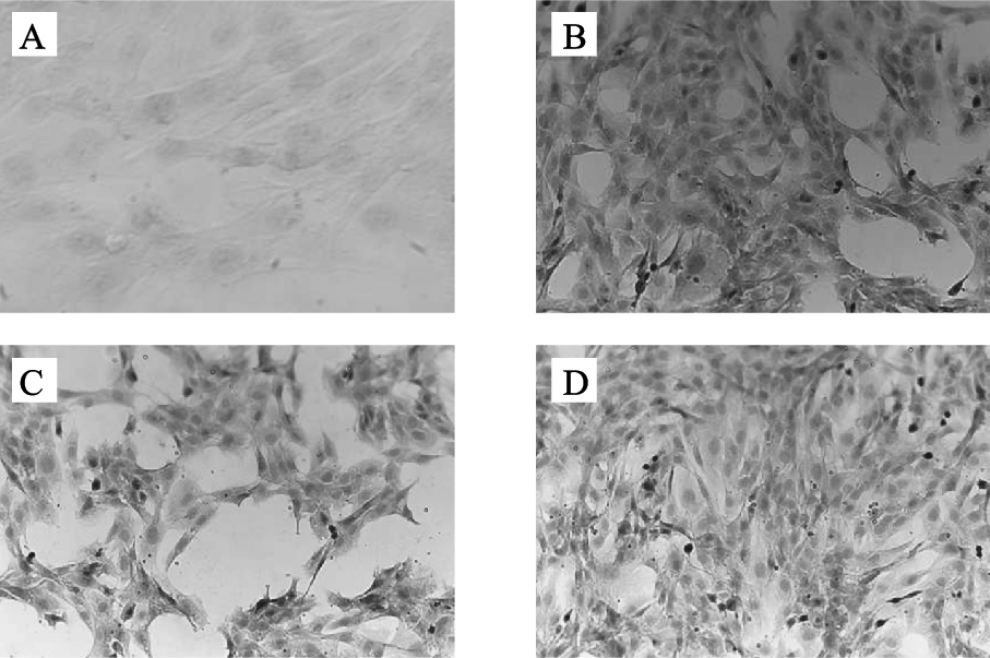 注:A:对照组;B:氧化应激组;C、D:20、80 μmol/L AM1241干预组。 图 1 AM1241对HSC-T6细胞α-SMA表达影响(细胞免疫化学染色,A:×400;B、C、D:×200) |