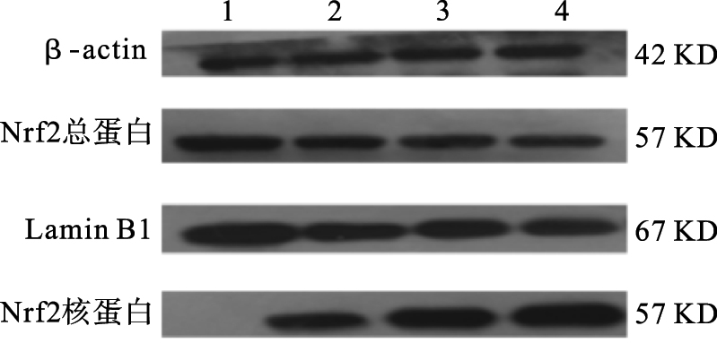 1.3.4 HSC-T6细胞总蛋白和胞核中Nrf2蛋白表达检测采用Western blot法,收集细胞,分别提取细胞总蛋白和核蛋白。(1)总蛋白提取:分别加入5倍细胞含有蛋白酶抑制剂的细胞裂解液,将细胞吹悬,冰上裂解15~20 min,用1 mL注射器对裂解液反复抽吸20次,再继续冰上裂解15~20 min,4 ℃离心,12 000 r/min 20 min;将上清移入1.5 mL 微量离心管中,加入1/2体积上样缓冲液,沸水中煮5 min;4 ℃离心,12 000 r/min 5 min,得细胞总蛋白,-20 ℃冰箱中保存备用。(2)核蛋白提取:每20 μL细胞沉淀加入200 μL含苯甲基磺酰氟(phenylmethylsulfonyl fluoride,PMSF)的细胞浆蛋白抽提试剂A,剧烈震荡5 s,把细胞沉淀完全悬浮并分散开,冰浴10 min;加入细胞浆蛋白抽提试剂B 10 μL,剧烈震荡5 s,冰浴1 min。再剧烈震荡5 s,4 ℃离心,12 000 r/min 5 min;沉淀加入50 μL含PMSF的细胞核蛋白抽提试剂,剧烈震荡30 s,把细胞沉淀完全悬浮并分散开,然后放回冰中,每隔1 min再剧烈震荡30 s,共30 min;4 ℃离心,12 000 r/min 10 min,立即吸取上清至一预冷的微量离心管中,即细胞核蛋白,-20 ℃冰箱中保存备用。(3)聚氰基丙烯酸正丁酯(bicinchoninic acid,BCA)蛋白定量法计算各组蛋白浓度:每组取20 μg蛋白进行聚丙烯酰胺凝胶电泳(polyacrylamide gelelectrophoresis,PAGE)湿转于PVDF膜上,5%牛血清白蛋白室温封闭2 h,兔抗鼠一抗Nrf2单克隆抗体(1:2 000),4 ℃孵育12 h,辣根过氧化物酶标记羊抗兔二抗(1:20 000)室温孵育1 h,Tris-HCl缓冲盐溶液清洗后默克密理博发光液显色、曝光,Image J 软件分析灰度值;以目的条带和内参条带比值进行半定量分析。