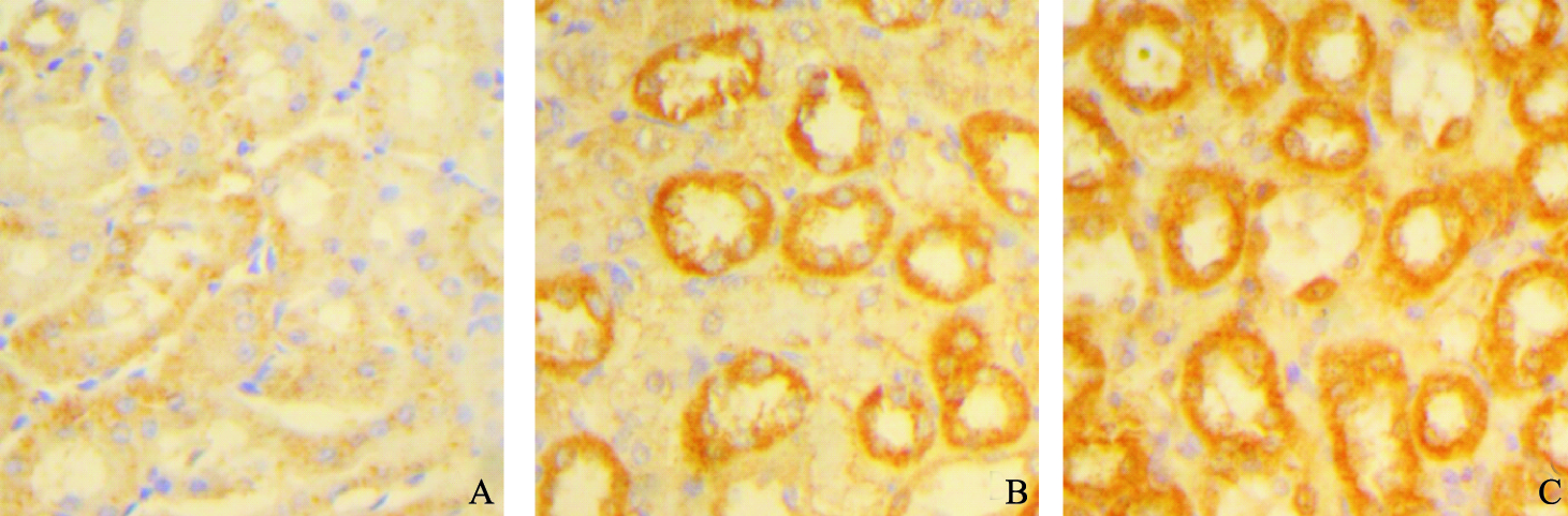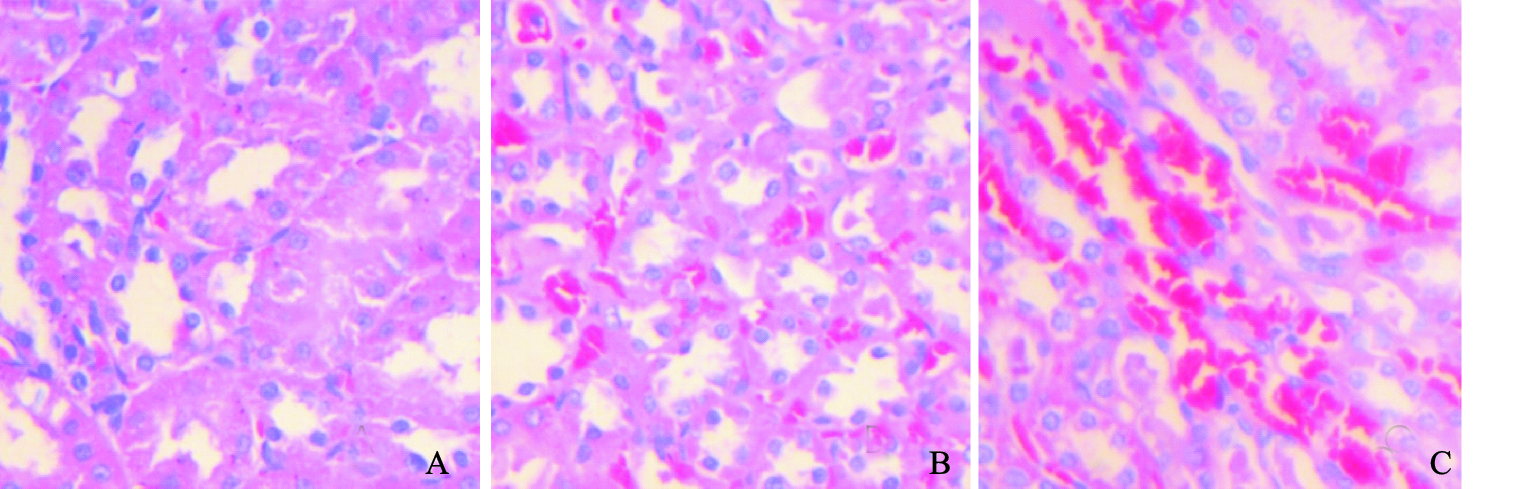 注:A:对照组;B:50 mg/L染氟组;C:100 mg/L染氟组。 图 1 染氟对大鼠肾组织病理形态学影响(HE×400) |