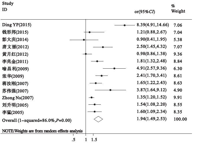 图 2 生物燃料烟雾暴露与中国居民COPD发生关系病例对照研究的meta分析 |