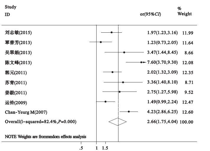 图 1 生物燃料烟雾暴露与中国居民COPD发生关系横断面研究的meta分析 |