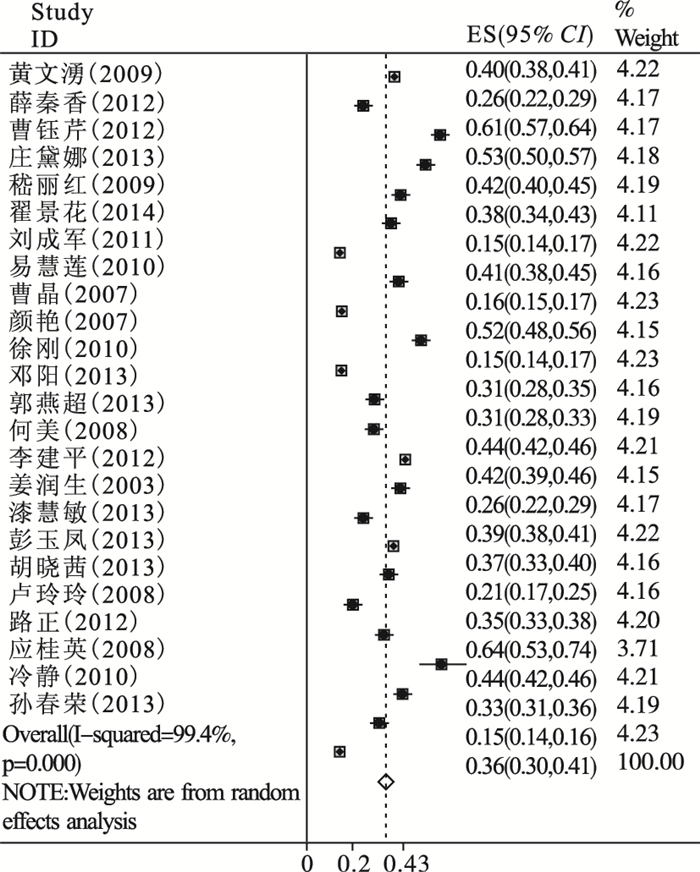 对纳入的24篇文献进行异质性检验,文献间存在显著的异质性(I2=99.4%,P < 0.001),故采用随机效应模型。meta分析结果显示,中国≥60岁老年人两周患病率为35.8%(95%CI=30.2%~41.4%)。