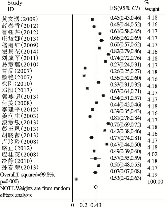 图 1 中国≥60岁老年人两周患病率meta分析 |