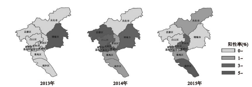 图 1 广州市2013—2015年H7N9禽流感阳性率地区分布图 |