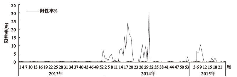 图 2 广州市2013—2015年H7N9亚型禽流感病毒阳性率时间分布图 |