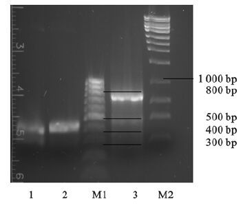 注:Lane1:VL片段;Lane2:VH片段;Lane3:重叠PCR扩增scFv基因片段;M1:100 bp DNA marker;M2:1kb DNA marker。 图 1 VH和VL基因的扩增及重叠PCR扩增结果 |