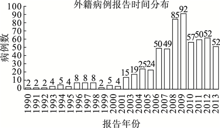 图 1 广州市1990-2013年外籍HIV/AIDS病例时间分布 |