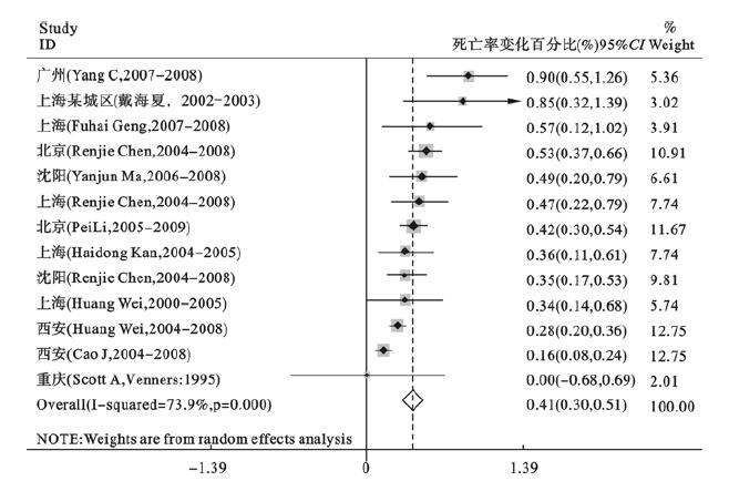 对纳入的11篇文献进行异质性检验,文献间存在显著的异质性(Q=45.97,P<0.001,I2=73.9%),采用随机效应模型。meta分析结果显示,在PM2.5日平均浓度上升10 μg/m3的情况下,人群死亡率较基期水平上升了0.37% [95%CI=0.26%~0.48%]。