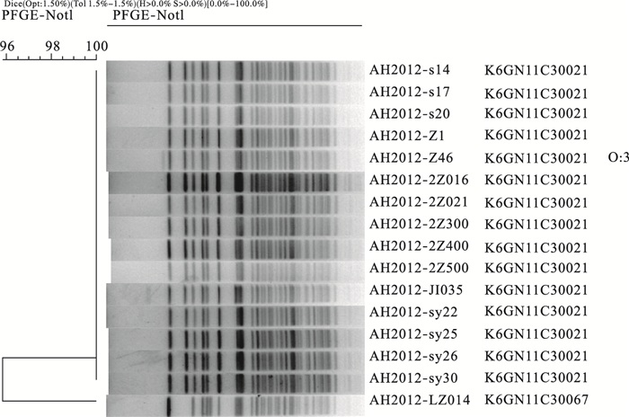 在冷冻冷藏食品中检出小肠结肠炎耶尔森菌在安徽省省尚属首次报告,为建立安徽省小肠结肠炎耶尔森菌菌种库,分子分型数据库和小肠结肠炎耶尔森菌病的防治工作提供了科学依据。foxA是小肠结肠炎耶尔森菌的一个保守基因,可用于小肠结肠炎耶尔森菌菌种的鉴定[14]。PCR扩增ail和foxA基因和分离培养的比对试验,结果显示PCR法能准确、快速检测标本中的小肠结肠炎耶尔森菌,为该病患者的早期诊断和治疗,提供一种快速有效的检测方法。分离培养法之所以能获得同样的检测结果,与增菌培养标本在分离培养之前的碱处理有密切关系。小肠结肠炎耶尔森菌的致病性主要是由位于染色体和毒力质粒上的毒力基因决定的,一般通过检测其中的毒力基因来判断该菌的致病性[15]。PFGE被广泛应用于细菌的分子分型研究[16-17],检测发现冷冻冷藏食品中的O:3型菌株与腹泻病人、宿主动物同型菌株[18]带型聚类图高度一致,同为K6GNIIC30021,血清型同为O:3型,说明在冷冻冷藏食品中分离的O:3型菌株与腹泻病人宿主动物标本中分离的同型菌株有密切的同源性关系,也进一步表明污染的冷冻冷藏食品是本地小肠结肠炎耶尔森菌病的传染源之一,应该引起高度重视。