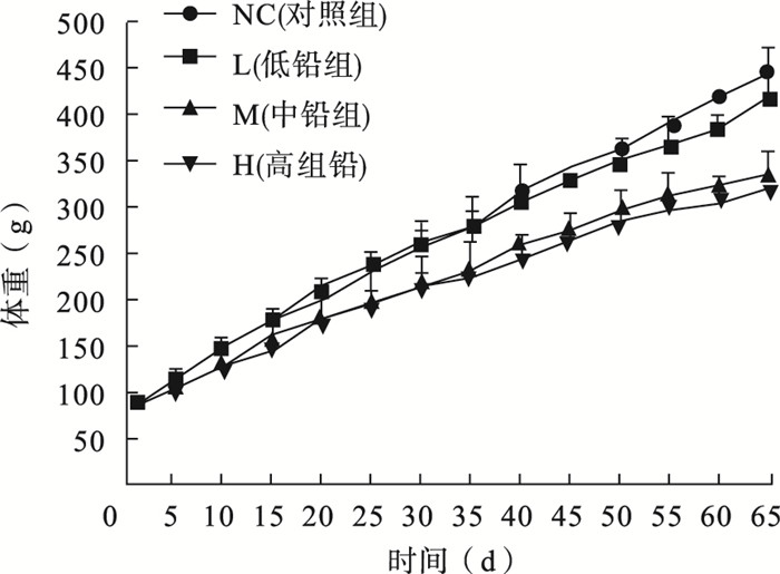 2 结果 2.1 染铅对大鼠体重影响(图 1)