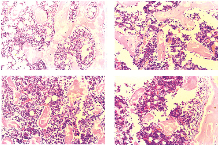 注:A:对照组;B、C、D:低、中、高剂量铅组。 图 2 染铅对大鼠骨组织形态影响(HE,×200) |