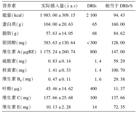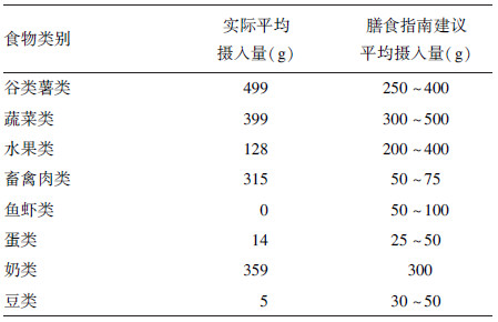 1.3 统计分析应用SPSS 17.0软件进行统计分析;采用营养计算器V2.70计算平均每人每日各种营养素的摄入量,并与中国居民膳食营养素参考摄入量(dietary reference intakes, DRIs)[9]进行比较。