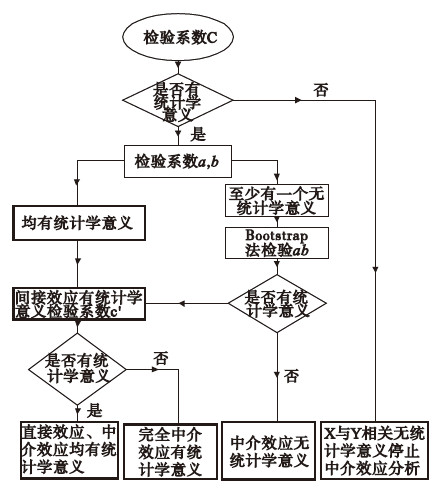中介效应分析是在分析自变量X对于因变量Y的效应的过程中,如果X对于Y的效应中部分或者全部通过变量M而实现,则称变量M为中介变量[8],假定所有相关变量都进行了中心化或者标准化之后,各变量间的相关关系如路径图(图 1)所示,其中c表示自变量X对因变量Y的总体效应,a、b分别为X对M、M对Y的效应量, c′为X对Y的直接效应。本研究采用的具体的中介效应分析方法为Bootstrap检验[8-9],Bootstrap法[9-10]是目前得到国内外学者广泛认可及应用的中介效应分析方法,具有不需满足先验分布条件,检验效能高,操作简单等优点。具体的检验思路如图 2所示。