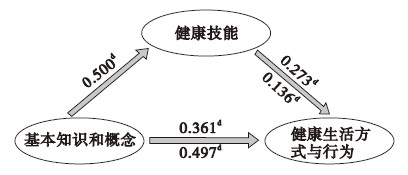 注:图中0.500为自变量(基本知识和概念)对中介变量(健康技能)的效应量a,0.273为中介变量(健康技能)对因变量(健康生活方式与行为)的效应量b,0.136为中介变量(健康技能)在自变量(基本知识和概念)与因变量(健康生活方式与行为)中的中介效应量a×b,0.361为自变量(基本知识和概念)对因变量(健康生活方式与行为)的间接效应量c′,0.497为(基本知识和概念)对因变量(健康生活方式与行为)的总效应量0.497;d P<0.01。 图 3 健康技能在基本知识和理念、健康生活方式与行为间的中介效应 |