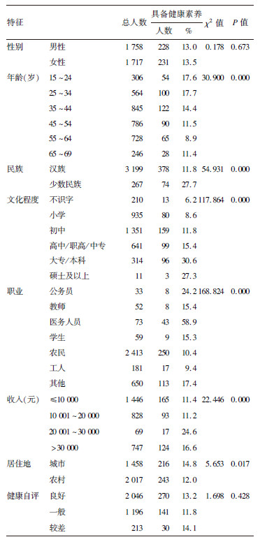 被调查者中有459人(13.2%)具有基本健康素养(总分≥80分);不同年龄、民族、职业、文化程度、收入、居住地的居民健康素养水平差异有统计学意义(P<0.05);总体上表现为少数民族居民健康素养水平(27.7%)高于汉族(11.8%),健康素养水平随年龄增加而下降,随着文化程度的升高而上升,高收入人群健康素养水平相对更高,城市居民健康素养水平(14.8%)高于农村(12.0%)。