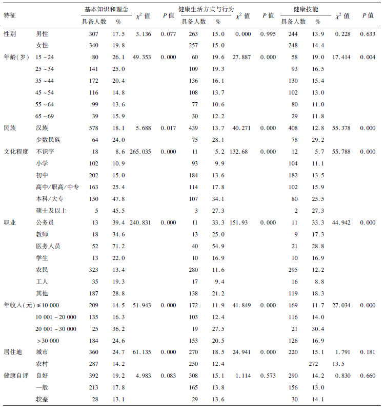 1.2 方法由经过统一培训的调查员采取入户面访方式进行问卷调查。调查问卷为统一研制的《全国居民健康素养监测调查问卷》[5],该问卷包括基本知识和理念、健康生活方式与行为、健康技能3个方面及人口学基本特征相关内容,共80道题,判断、单选题1分/题,多选题2分/题,共计满分100分。健康素养具备标准[6]:总得分≥80分,可认为具有基本健康素养,某方面得分达到该方面总分≥80%, 者,认为具备该方面健康素养。