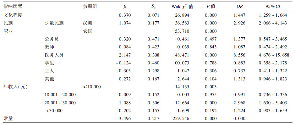 以健康素养具备情况(不具备=0,具备=1) 作为因变量,以性别、年龄、民族、文化程度、职业、收入、居住地及健康自评共8个因素作为自变量进行多因素非条件logistic回归分析,按照α入=0.05,α出=0.10的水准,采用向前的似然比法进行变量筛选。结果显示,文化程度、民族、职业及收入是湖南省居民健康素养的影响因素(P<0.05)。总体上表现为随着文化程度的升高,健康素养水平升高(OR=1.447,95%CI=1.259~1.664);少数民族的健康素养水平高于汉族(OR=2.926, 95%CI=2.066~4.143);医务人员健康素养水平高于农民(OR=8.556, 95%CI=4.676~15.658);年收入在20 001~30 000元的居民健康素养具备可能性高于年收入≤10 000元的居民(OR=2.968,95%CI=1.630~5.403)。