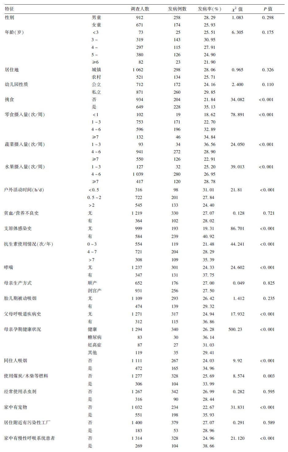 2 结果 2.1 一般情况牡丹江市1 583名学龄前儿童中,男童912人(57.61%),女童671人(42.39%);年龄<3岁73人(4.61%),3岁~319人(20.15%),4岁~297人(18.76%),5岁~380人(24.00%),≥6岁82人(5.18%);居住在城镇1 062人(67.09%),农村521人(32.91%);公立幼儿园712人(44.98%),私立幼儿园871人(50.02%)。