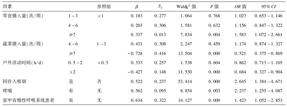 以牡丹江市学龄前儿童是否RRTI为因变量(0=否,1=是),以是否挑食、零食摄入量、蔬菜摄入量、水果摄入量、户外活动时间、有无支原体感染史、抗生素使用情况、有无哮喘、父母有无呼吸道疾病史、母亲孕期健康状况、同住人是否吸烟、是否使用煤炭/木柴等燃料、家中有无宠物、家中有无慢性呼吸系统患者等14个因素为自变量进行多因素非条件logistic回归分析。结果显示,零食摄入量≥7次/周、同住人吸烟、哮喘和家中有慢性呼吸系统患者是牡丹江市学龄前儿童RRTI的危险因素,蔬菜摄入量≥7次/周和户外活动时间≥2 h/d是牡丹江市学龄前儿童RRTI的保护性因素。