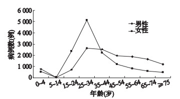 对268 040例梅毒病例进行年龄组分类,0~≥75岁每个年龄组均有梅毒病例出现,胎传梅毒均在 < 15岁年龄组,0~4岁死亡35例,占总死亡人数46.67%(35/75)。梅毒病例性别男性占49.88%(133 696/268 040),女性占50.12%(134 344/268 040),女性略多于男性。男性和女性不同年龄组病例呈现出不同的特征,共同特征是在25~34岁年龄组男女性病例均达到高峰,发病率为14.94/10万。不同之处是女性从15~34岁年龄组病例数占女性年龄组总病例数的55.75%(74 897/134 344),明显高于男性15~34岁同年龄组病例数的25.14%(33 610/133 696),而到35~54岁女性年龄组病例数占总病例数的25.42%(34 145/134 344),又明显低于男性同年龄组总病例数的33.67%(45 015/133 696),≥55岁的男性病例明显多于女性病例,≥55岁男性病例数占男性总病例数的35.29%(47 179/133 696),而≥55岁女性病例数占女性总病例数的14.54%(19 531/134 344),≥55岁男女性病例比为2.42:1。对梅毒病例的职业分类显示,梅毒病例数比率排在前5位的分别是农民占50.67%(135 815/268 040),家政、家务及待业占10.69%(28 654/268 040),公职人员占8.86%(23 744/268 040),散居儿童占4.22%(11 305/268 040),工人占4.15%(11 124/268 040)。得关注的是学生梅毒病例数量增多超过了海员和长途司机人员。