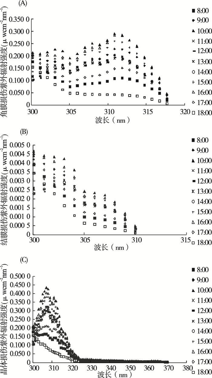 图 5A、B和C分别表示每1 h间隔不同时间点眼部暴露各波长眼角膜损伤、结膜损伤和晶体损伤生物有效紫外辐射分布。结果显示,眼角膜损伤、结膜损伤和晶体损伤紫外辐射光谱截止波长分别为318、310和371 nm;眼部暴露结膜损伤有效紫外辐射在所有时间点上均呈现随波长增加辐射减小趋势,10:00,300 nm最大值约为0.004 6 μw cm-2nm-1。眼暴露角膜损伤和晶体损伤有效紫外辐射分布,在18:00,均呈现随波长增加辐射减小趋势,而在其它时间点,角膜损伤辐射在311 nm出现峰值,在305 nm出现谷值,晶体损伤辐射在307 nm出现峰值;10:00,311 nm角膜损伤最大辐射值约为0.300 0 μw cm-2nm-1,而307 nm晶体损伤最大辐射值约为0.440 0 μw cm-2nm-1。